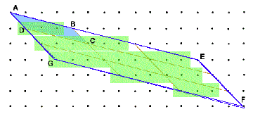 Step 1: Pick's theorem is proven for the general parallelogram. This is suprisingly hard. The proof goes something like this. Tile a large area with copies of the original parallelogram (ABCD in the picture) to get a large parallelogram (AEFG in the picture). Now approximate the area of the large by rectangular regions centered(the yellow regions in the picture) centered around the interior and half minus one of the boundary dots (yellow portion of picture, here 27). It turns out that the error becomes small relative to the number of tiles. Dividing by the number of tiles (here 9) one shows, with some difficulty, that the approximation B/2 + I - 1 of the area of the original parallelogram is good to less than one unit if we have enough tiles. But since we know that the area of a dot parallelogram must be an integer the approximate answer must be exact.