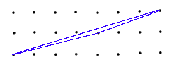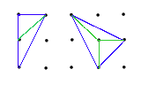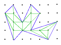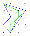 Step 3:We now triangulate our dot figure, that is, break it up into triangles. Unlike early in this worksheet the sides need not be horizontal or vertical so this can always be done. Also, as seen in the picture, if a triangle has at least one boundary dot which is not a vertex, or has an interior dot, then it can be further subdivided. Thus we can divide up our figure into dot triangles with B=3 and I=0. Since we know each triangle has area 1/2 it remains to count up these triangles.